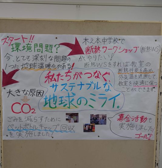 現在、全校でペットボトルキャップの回収活動を行っているほか、「断熱ワークショップ」の実現に向けた準備も進めています。このワークショップでは、教室の窓に二重サッシを取り付けたり、壁に断熱材を設置したりすることで、より効率的で快適な学習環境を整えることを目指しています。必要な資金を集めるため、生徒会を中心に募金活動なども地域で実施しています。
