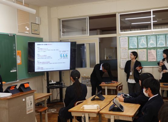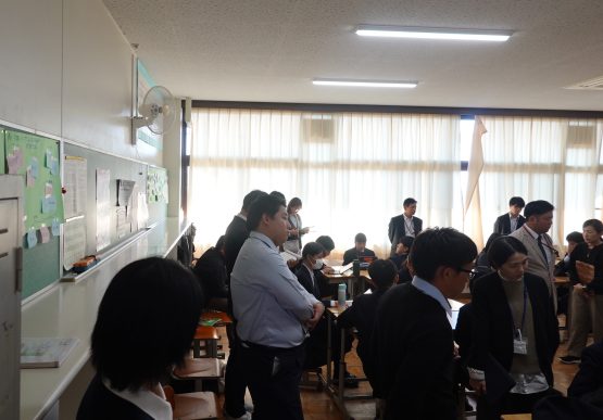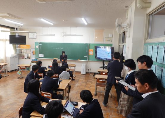 昨日、2年生の社会科の授業公開を行い、市内の社会科の先生方にご参観いただきました。今回の授業は、教員の研修の一環としても位置づけ、「生徒が主体となる授業形態」の実現を目指しました。ICTを活用しながら、生徒たちは自ら調べ、考え、意見をまとめて発信する学習に取り組みました。これからの社会に必要とされる、情報の活用力や表現力、アウトプットの力を育むことをねらいとしています。参観された先生方からは、生徒が積極的に学びに向かう姿勢や、ICTの効果的な活用に対して高評価をいただきました。今後も、生徒一人ひとりが主体的に学びに取り組む授業づくりを進めてまいります。
