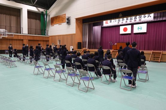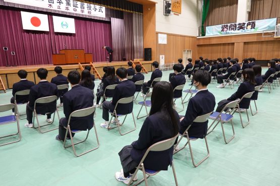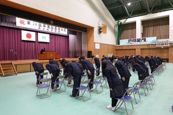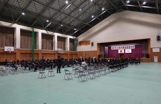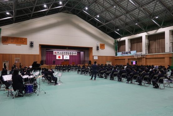 本日、三年生は明日の卒業式を前に、表彰伝達式、同窓会入会式、そして全校予行練習に臨みました。表彰伝達では、この三年間の努力の積み重ねが形となり、多くの生徒がその歩みを讃えられました。同窓会入会式では、卒業生が本校の同窓生として新たな一歩を踏み出しました。また、予行練習では、証書授与や呼名、式歌など一つ一つの所作を丁寧に確認しました。張り詰めた空気の中にも、どこか晴れやかな表情が見られ、三年間の成長を強く感じる時間となりました。いよいよ明日は卒業式です。仲間と過ごす最後の一日。これまで支えてくださったご家族、地域の皆様への感謝を胸に、堂々と巣立ってほしいと願っています。「満開笑顔 〜みんなが輝く毎日に〜」卒業生一人ひとりの未来が、希望に満ちたものでありますように。温かなご臨席を、どうぞよろしくお願いいたします。