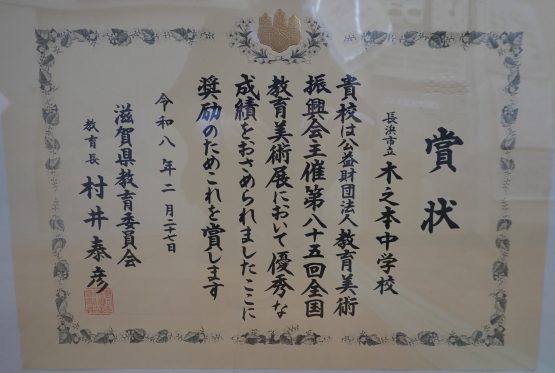 本日、修了式を行いました。各学年の代表生徒に修了証を授与し、凛とした雰囲気の中、一年間の学びの締めくくりにふさわしい時間となりました。式では、各学年の代表生徒が3学期を振り返り、それぞれの成長と歩みを確かめ合いました。また、「木中輝きさん」の表彰をはじめ、各種表彰伝達を行いました。中でも、全国教育美術展において本校が地区学校賞を受賞し、滋賀県の中学校で唯一という大変名誉ある賞をいただきました。日々の地道な取組と、一人ひとりの素晴らしい作品の積み重ねが実を結んだものであり、本校の誇りとするところです。