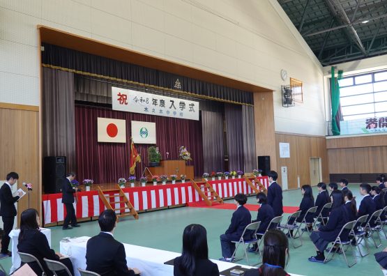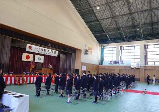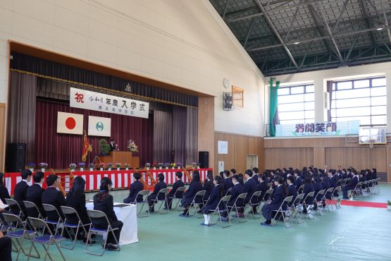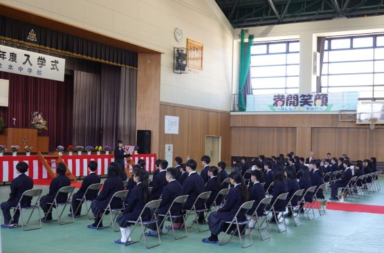 春の陽光がやわらかく降り注ぐ中、桜は満開のピークを過ぎながらも、美しく花びらを揺らせていました。そんな穏やかな晴天のもと、令和8年度入学式を挙行し、51名の新入生を迎えました。新入生は、少しの緊張と期待を胸に、凛とした表情で式に臨み、新たな一歩を踏み出しました。その姿からは、中学校生活への希望と決意が感じられました。