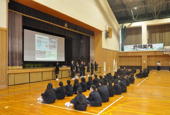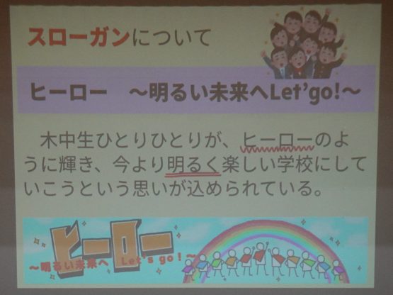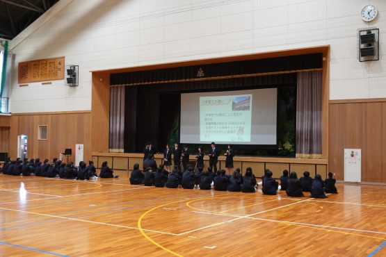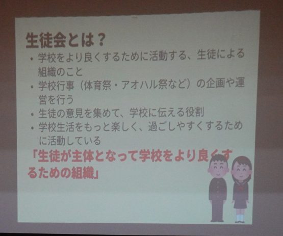 生徒会委員会の活動紹介では、よりよい学校生活をつくるために、それぞれの委員会がどのような思いで活動しているのかが伝えられました。学校生活の説明では、教科の授業や行事について丁寧に紹介され、新入生も安心して中学校生活のスタートを切ることができそうです。