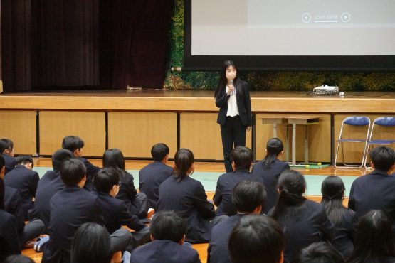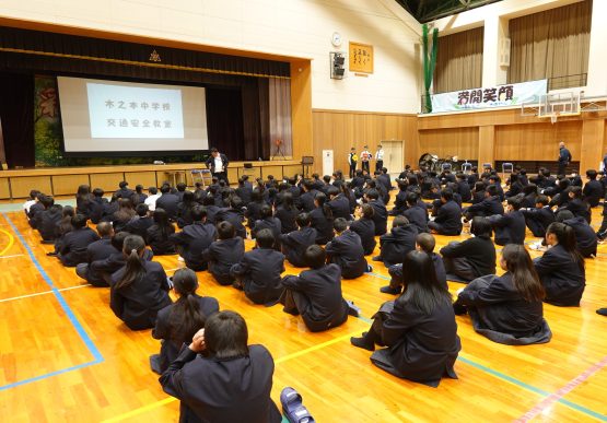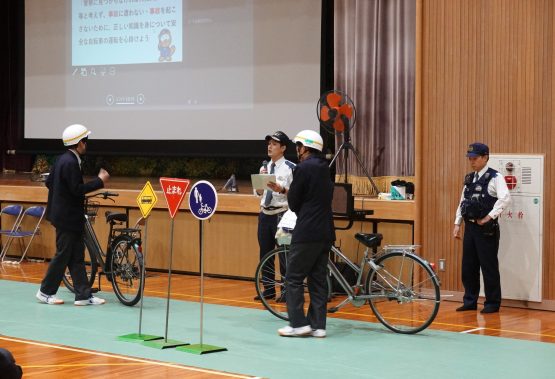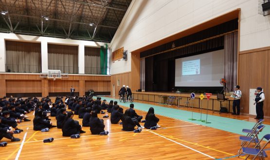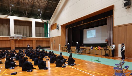 また、警察署のご指導のもと、生徒会の生徒が交通マナーの実演を行い、自転車の正しい乗り方や安全確認の大切さについて、実際の場面を通して学びを深めました。